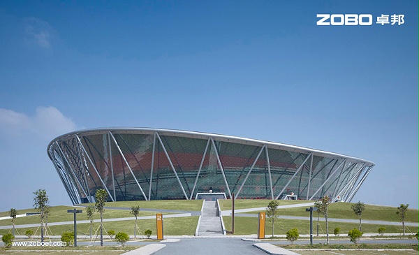 2009年10月,由ZOBO卓邦承建的东莞体育馆扩声工程全部竣工。在该场馆改建扩声方案中。为了保证体育馆的语言清晰度,必须从建声和电声两个进行设计:尽量降低体育馆的混响时间,防止和回声声聚焦,颤动回声等声学缺陷。按照行业标准,根据体育场体积,容纳人数,混响时间应为2.1±0.1s(满场500HZ~1000HZ),这样就要重新更换原有的部分装饰材料。在新的装饰改建中重新将原使用了近10年的四周墙面已吸音效果不佳穿孔吸音板更换为防火阻燃的新型结构的穿孔吸音板。观众席侧墙安装成品木质吸音板,吸音板穿孔率大于10%,木质吸音板后放置32kg/m3×50mm吸音棉板,留50mm空腔。在屋顶的网架上重新增加了质量轻的中空三棱柱的空间吸声体。通过这样大范围的建声改进。体育馆的内有满意的清晰度,全场有比较均匀的声学效果及无声聚焦、颤动回声等声缺陷,使直达声、早期反射声声场分布均匀、混响声场扩散。混响时间明显比未改造前好许多。