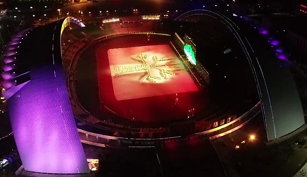 河南周口市体育场总建筑面积34900平方米(不含看台面积及入口架空层),看台面积19370平方米,可容纳3.1万座位。本次活动分为主看台区域和南北看台区域,可容纳约2万座位。演员区域在内场400米标准跑道和68x105米标准足球场内表演。舞蹈演员呈现形成一个椭圆形及方形阵容进行表演。在整个音响系统设计中需要克服高温,潮湿,多雨;观众席宽度大;后场区域到看台位置远;现场拾音预延迟和反射区等众多技术难点。