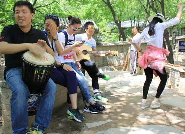 爬山重在享受过程,爬累了咱就歇会儿唱会儿歌儿,个个儿都是乐器好手!嘿你看对面儿的爬山人都在驻足看我们!